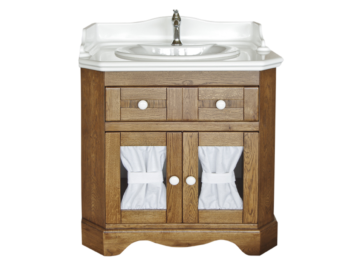 Плотът на шкафа е изработен от водоустойчив HDF покрит с акрилни смоли. Грундиран и лакиран с водоустойчиви грундове и лакове, след което е полиран за да достигне визията и блясъка на мивката вградена в него. Корпуса на шкафа е изработен от водоустойчив HDF, фурнирован с естествен дъбов фурнир, обработен с импрегнатори и водоустойчиви грундове и лакове. Под мивката сме монтирали чекмедже, за да се използва максимално мястото, а под чекмеджето две вратички изработени от масивна дървесина.